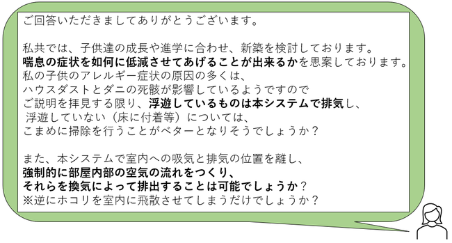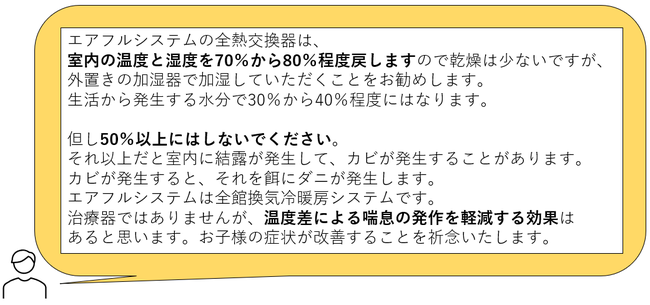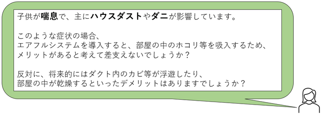 今回は「全館24時間換気システム エアフル」について、お子様が喘息の症状をお持ちの方からいただいたお問合せ内容をお伝えします。